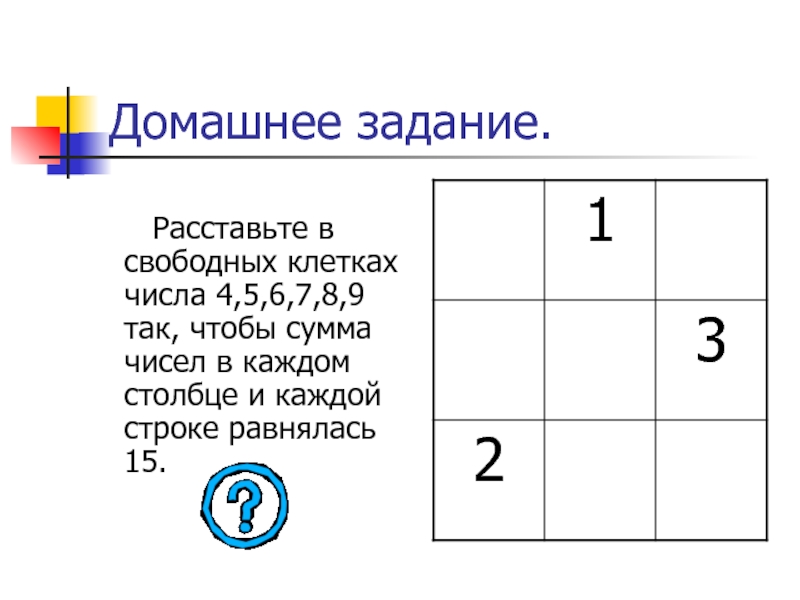 Домашнее задание.    Расставьте в свободных клетках числа 4,5,6,7,8,9 так, чтобы сумма чисел в каждом