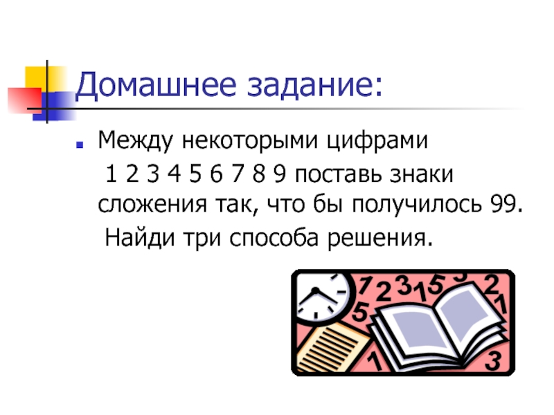 Домашнее задание: Между некоторыми цифрами 	1 2 3 4 5 6 7 8 9 поставь знаки сложения