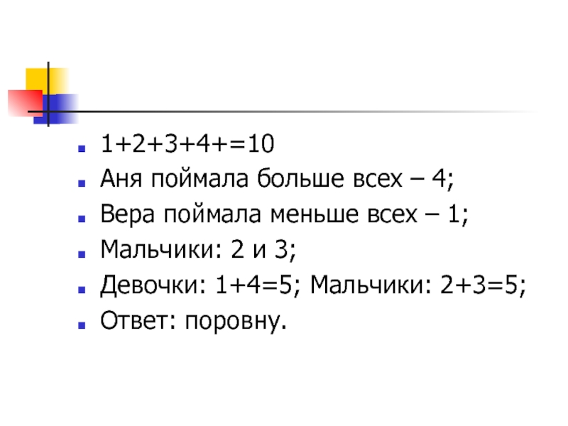 1+2+3+4+=10Аня поймала больше всех – 4;Вера поймала меньше всех – 1;Мальчики: 2 и 3;Девочки: 1+4=5; Мальчики: 2+3=5;Ответ: