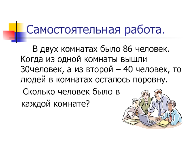 Самостоятельная работа. 		В двух комнатах было 86 человек. Когда из одной комнаты вышли 30человек, а из второй