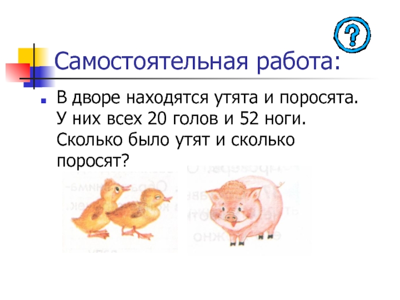 Самостоятельная работа: В дворе находятся утята и поросята. У них всех 20 голов и 52 ноги. Сколько