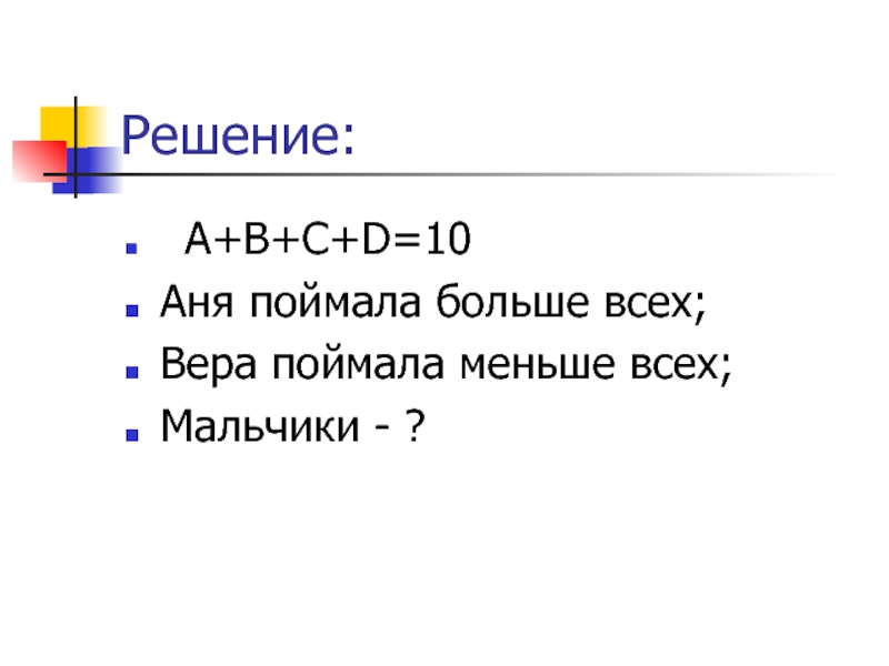 Решение:   А+В+С+D=10Аня поймала больше всех;Вера поймала меньше всех;Мальчики - ?