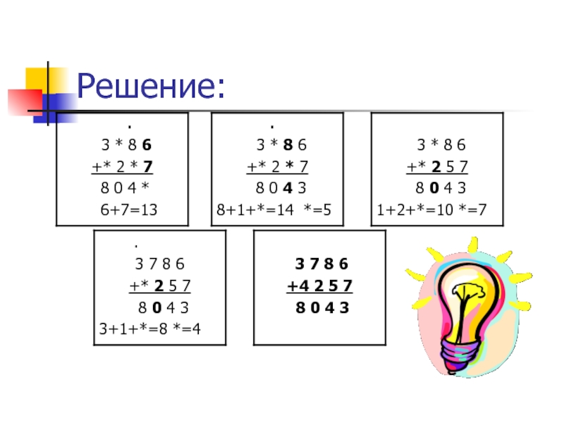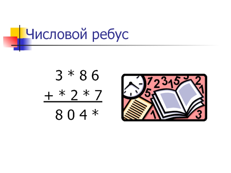 Числовой ребус  		3 * 8 6	+ * 2 * 7		8 0 4 *