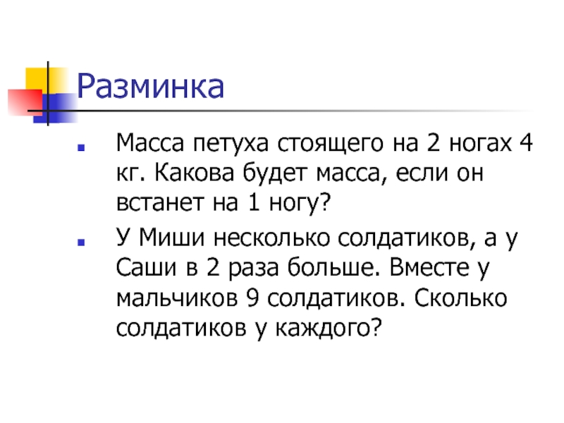 У Миши несколько солдатиков, а у Саши в 2 раза больше. Вместе у мальчиков 9 солдатиков. Сколько солдатиков у каждого?