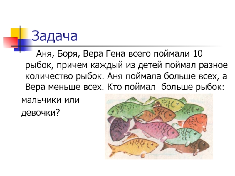 Задача		 Аня, Боря, Вера Гена всего поймали 10 рыбок, причем каждый из детей поймал разное количество рыбок.