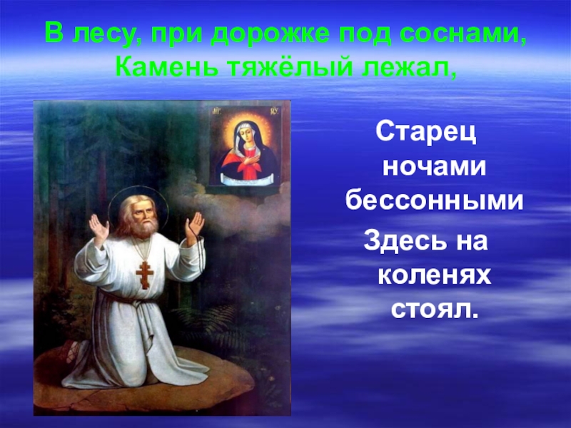 В лесу, при дорожке под соснами, Камень тяжёлый лежал, Старец ночами бессоннымиЗдесь на коленях стоял.