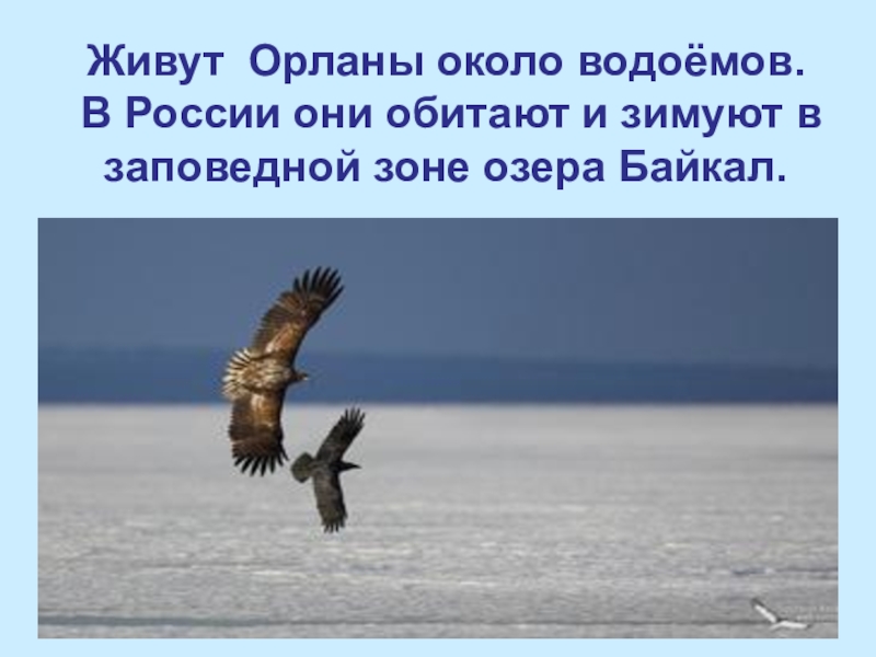 Слайд 5Живут Орланы около водоёмов. В России они обитают и зимуют в