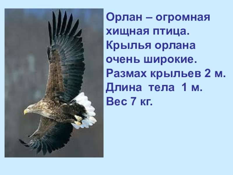 Орлан – огромная хищная птица. Крылья орлана очень широкие. Размах крыльев 2 м.Длина тела 1 м.Вес 7