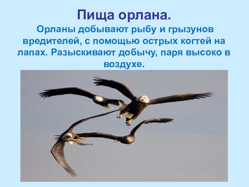 Пища орлана. Орланы добывают рыбу и грызунов вредителей, с помощью острых когтей на лапах. Разыскивают добычу, паря высоко