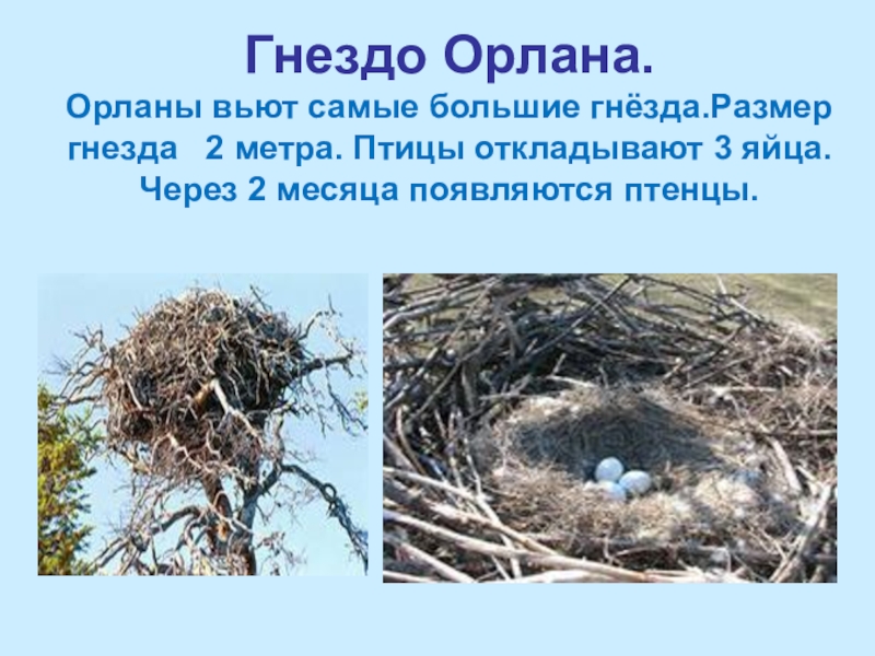 Гнездо Орлана.Орланы вьют самые большие гнёзда.Размер гнезда  2 метра. Птицы откладывают 3 яйца. Через 2 месяца