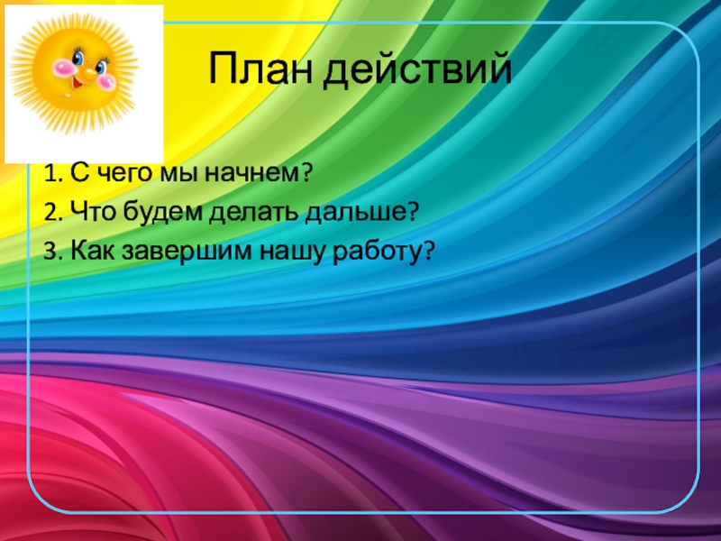 План действий1. С чего мы начнем?2. Что будем делать дальше?3. Как завершим нашу работу?