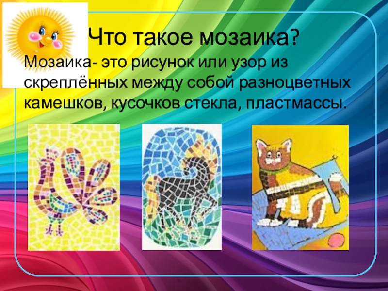 Что такое мозаика?Мозаика- это рисунок или узор из скреплённых между собой разноцветных камешков, кусочков стекла, пластмассы.