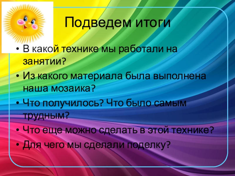 Подведем итогиВ какой технике мы работали на занятии?Из какого материала была выполнена наша мозаика?Что получилось? Что было