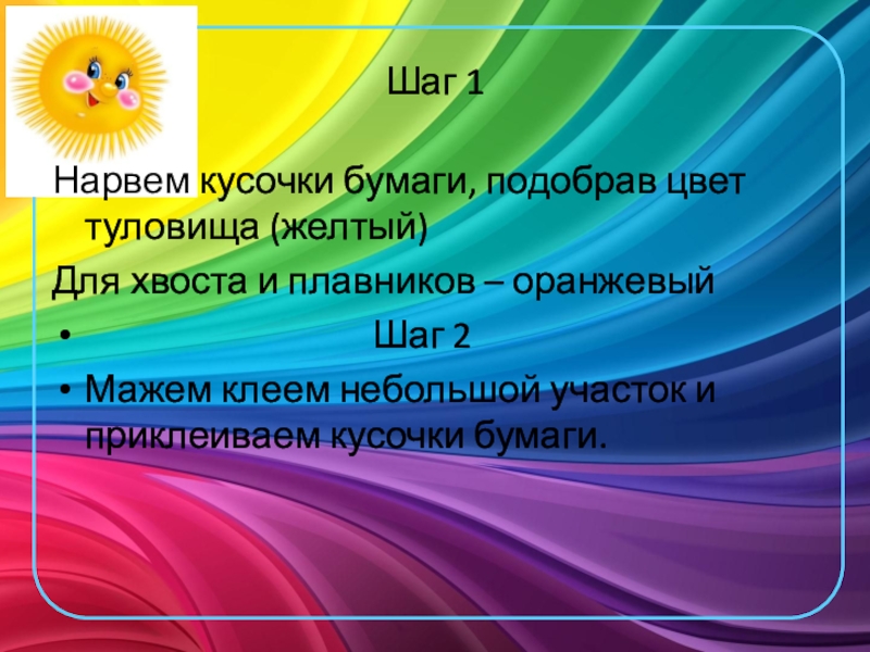 Шаг 1Нарвем кусочки бумаги, подобрав цвет туловища (желтый)Для хвоста и плавников – оранжевый
