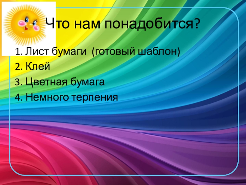 Что нам понадобится?1. Лист бумаги (готовый шаблон)2. Клей3. Цветная бумага4. Немного терпения
