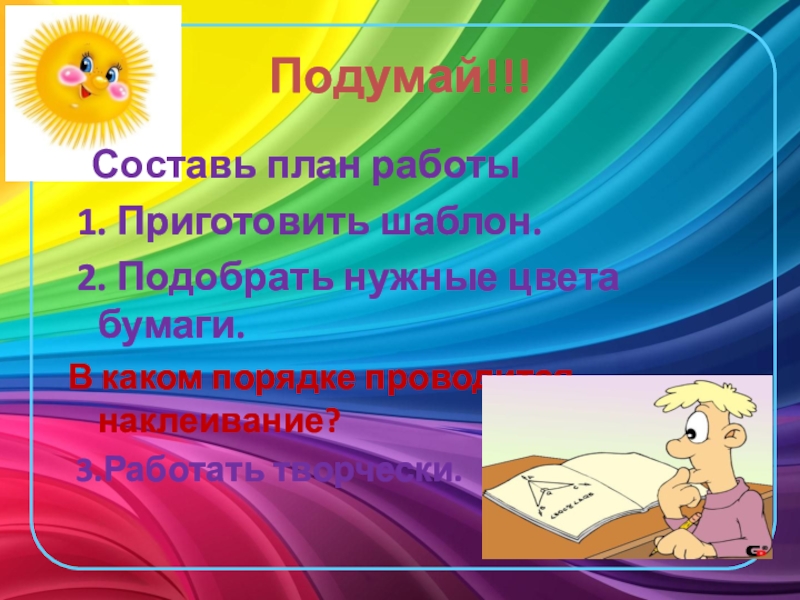 Подумай!!!  Составь план работы 1. Приготовить шаблон. 2. Подобрать нужные цвета бумаги.В каком порядке проводится наклеивание?