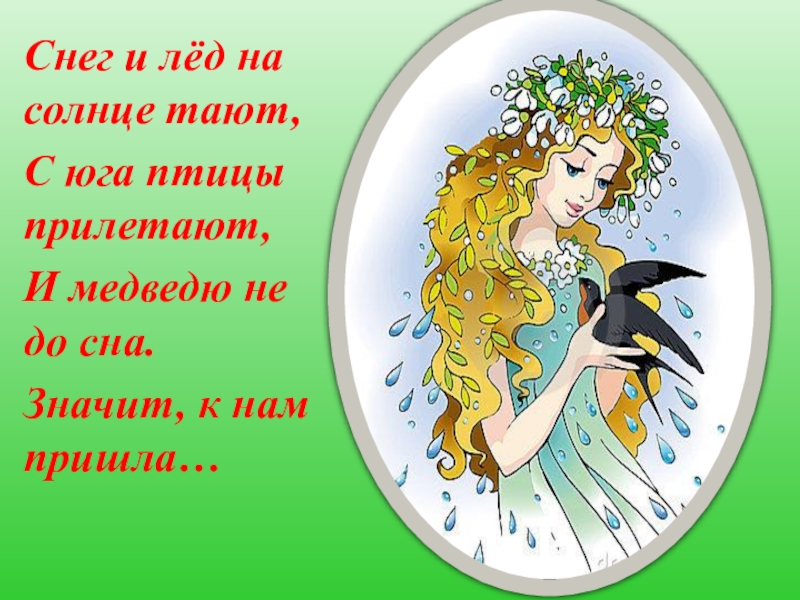 Снег и лёд на солнце тают,С юга птицы прилетают,И медведю не до сна.Значит, к нам пришла…