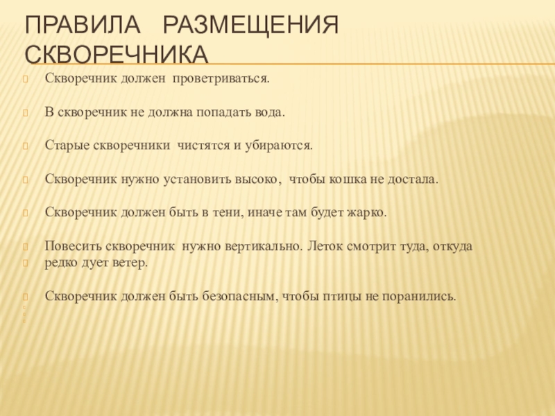 ПРАВИЛА  РАЗМЕЩЕНИЯ  СКВОРЕЧНИКАСкворечник должен проветриваться. В скворечник не должна попадать вода. Старые скворечники чистятся и