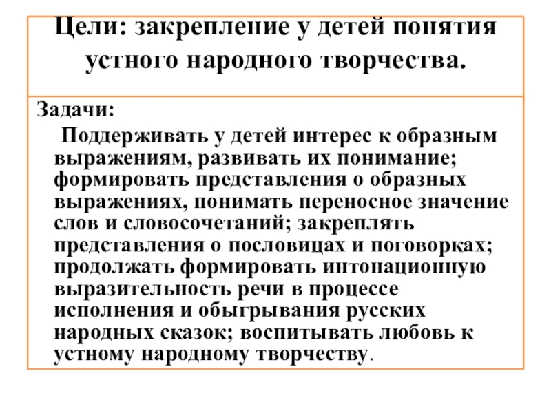 Цели: закрепление у детей понятия устного народного творчества.   Задачи:	Поддерживать у детей интерес к образным выражениям, развивать