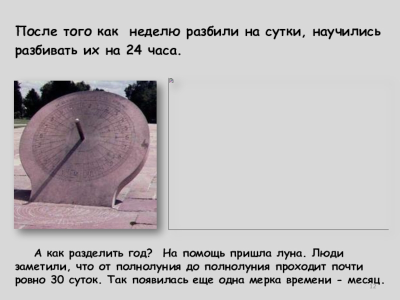 А как разделить год? На помощь пришла луна. Люди заметили, что от полнолуния до полнолуния проходит почти ровно 30 суток. Так появилась еще одна мерка времени - месяц.