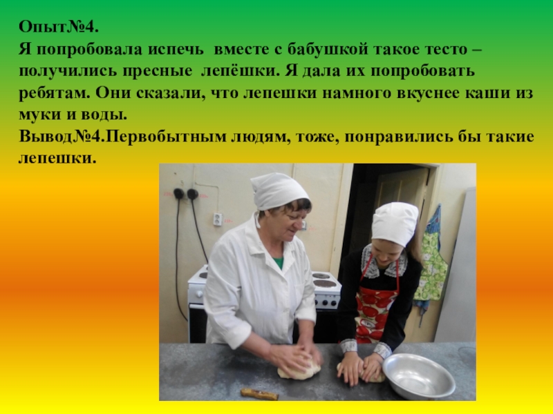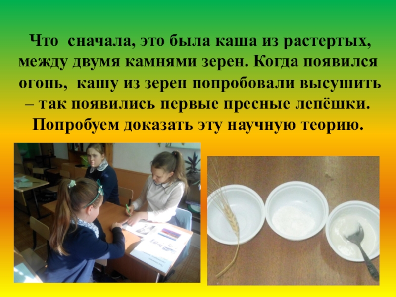 зерен. Когда появился огонь, кашу из зерен попробовали высушить – так появились первые пресные лепёшки. Попробуем доказать эту научную теорию.