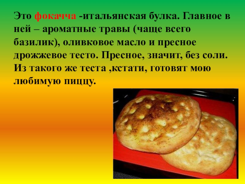 Слайд 44Это фокачча -итальянская булка. Главное в ней – ароматные травы (чаще