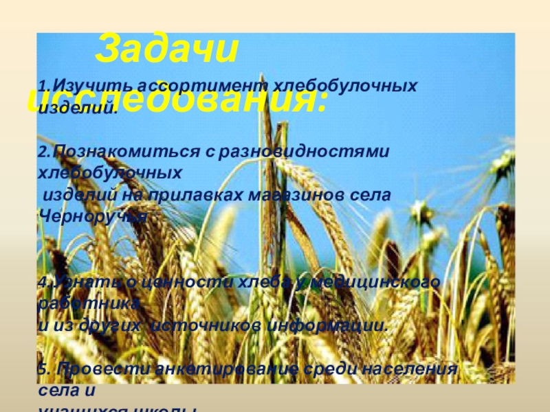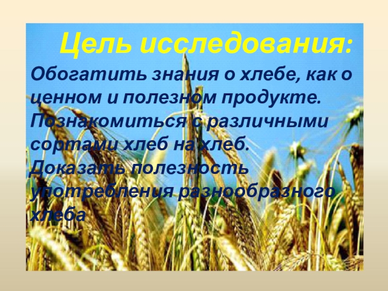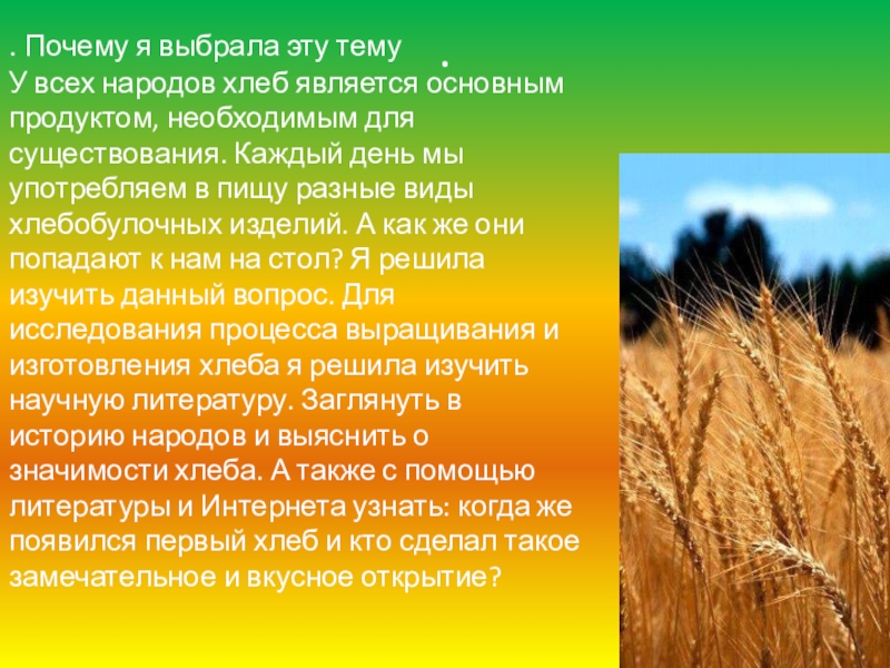 продуктом, необходимым для существования. Каждый день мы употребляем в пищу разные виды хлебобулочных изделий. А как же они попадают к нам на стол? Я решила изучить данный вопрос. Для исследования процесса выращивания и изготовления хлеба я решила изучить научную литературу. Заглянуть в историю народов и выяснить о значимости хлеба. А также с помощью литературы и Интернета узнать: когда же появился первый хлеб и кто сделал такое замечательное и вкусное открытие?