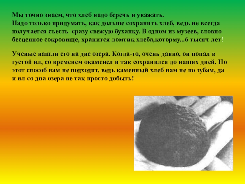 Надо только придумать, как дольше сохранить хлеб, ведь не всегда получается съесть сразу свежую буханку. В одном из музеев, словно бесценное сокровище, хранится ломтик хлеба,которму...6 тысяч лет!