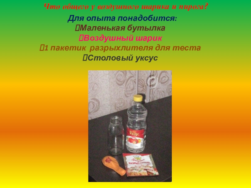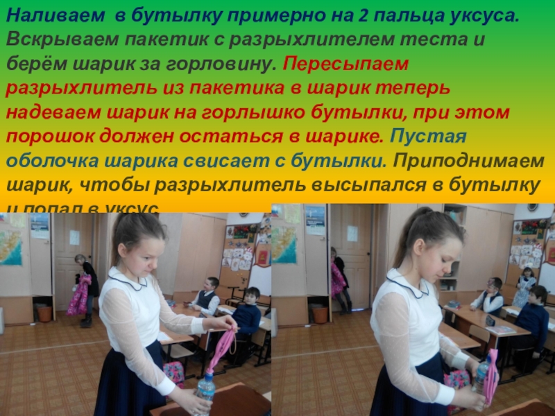 Слайд 26Наливаем в бутылку примерно на 2 пальца уксуса. Вскрываем пакетик с