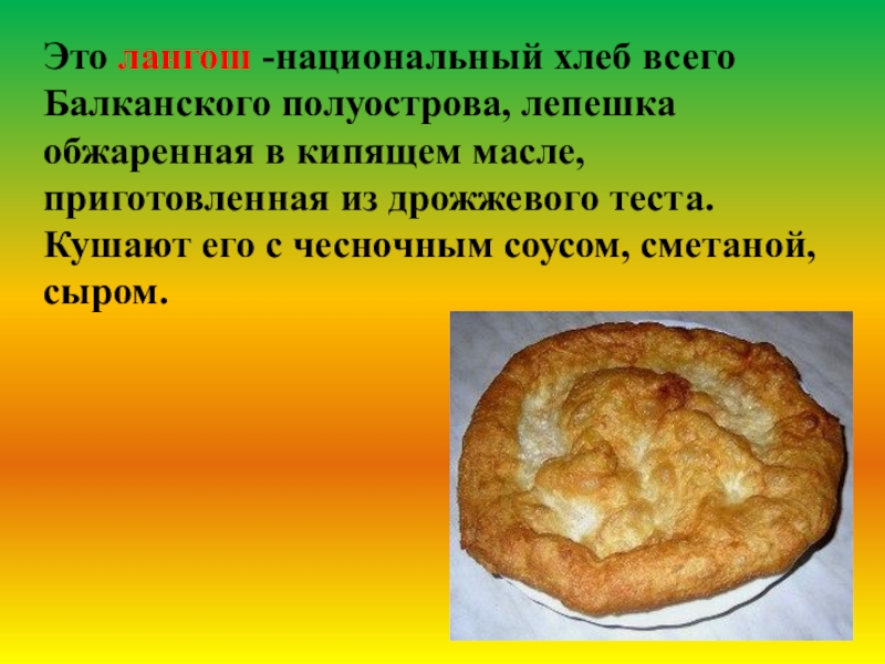 Слайд 45Это лангош -национальный хлеб всего Балканского полуострова, лепешка обжаренная в кипящем