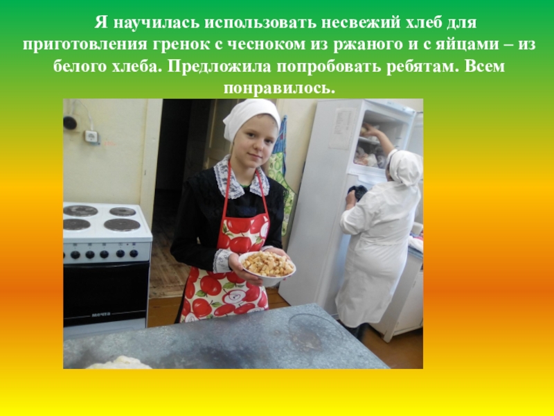 Слайд 30Я научилась использовать несвежий хлеб для приготовления гренок с чесноком из
