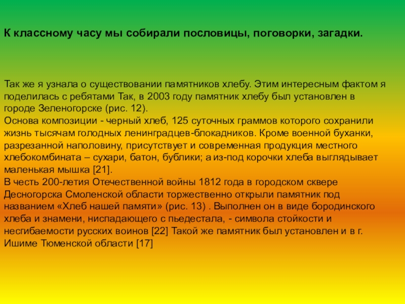 о существовании памятников хлебу. Этим интересным фактом я поделилась с ребятами Так, в 2003 году памятник хлебу был установлен в городе Зеленогорске (рис. 12).
