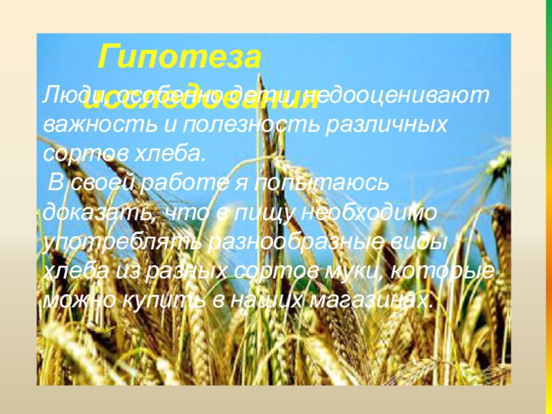 В своей работе я попытаюсь доказать, что в пищу необходимо употреблять разнообразные виды хлеба из разных сортов муки, которые можно купить в наших магазинах.