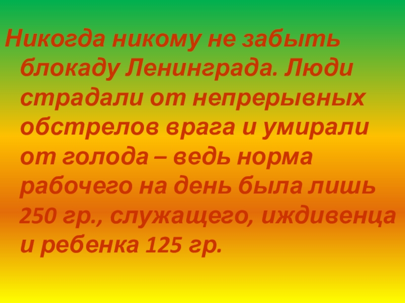 Слайд 49Никогда никому не забыть блокаду Ленинграда. Люди страдали от непрерывных обстрелов