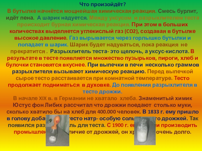 разрыхлителем теста и берём шарик за горловину. Пересыпаем разрыхлитель из пакетика в шарик теперь надеваем шарик на горлышко бутылки, при этом порошок должен остаться в шарике. Пустая оболочка шарика свисает с бутылки. Приподнимаем шарик, чтобы разрыхлитель высыпался в бутылку и попал в уксус.