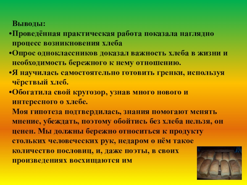 Моя гипотеза подтвердилась, знания помогают менять мнение, убеждать, поэтому обойтись без хлеба нельзя, он ценен. Мы должны бережно относиться к продукту стольких человеческих рук, недаром о нём такое количество пословиц, и, даже поэты, в своих произведениях восхищаются им