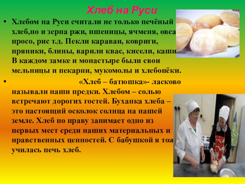 «Хлеб – батюшка»- ласково называли наши предки. Хлебом – солью встречают дорогих гостей. Буханка хлеба – это настоящий осколок солнца на нашей земле. Хлеб по праву занимает одно из первых мест среди наших материальных и нравственных ценностей. С бабушкой я тоже училась печь хлеб.