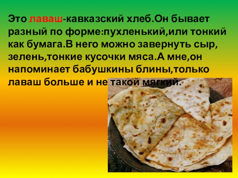 Слайд 43Это лаваш-кавказский хлеб.Он бывает разный по форме:пухленький,или тонкий как бумага.В него