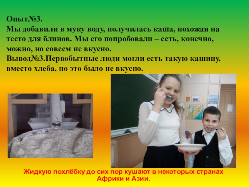 Вывод№3.Первобытные люди могли есть такую кашицу, вместо хлеба, но это было не вкусно.