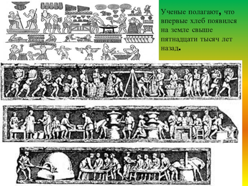Слайд 16Ученые полагают, что впервые хлеб появился на земле свыше пятнадцати тысяч лет