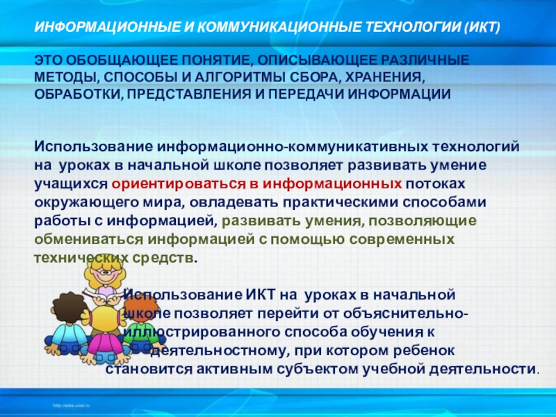 Использование ИКТ на уроках в начальной школе позволяет перейти от объяснительно- иллюстрированного способа обучения к деятельностному, при котором ребенок становится активным субъектом учебной деятельности.