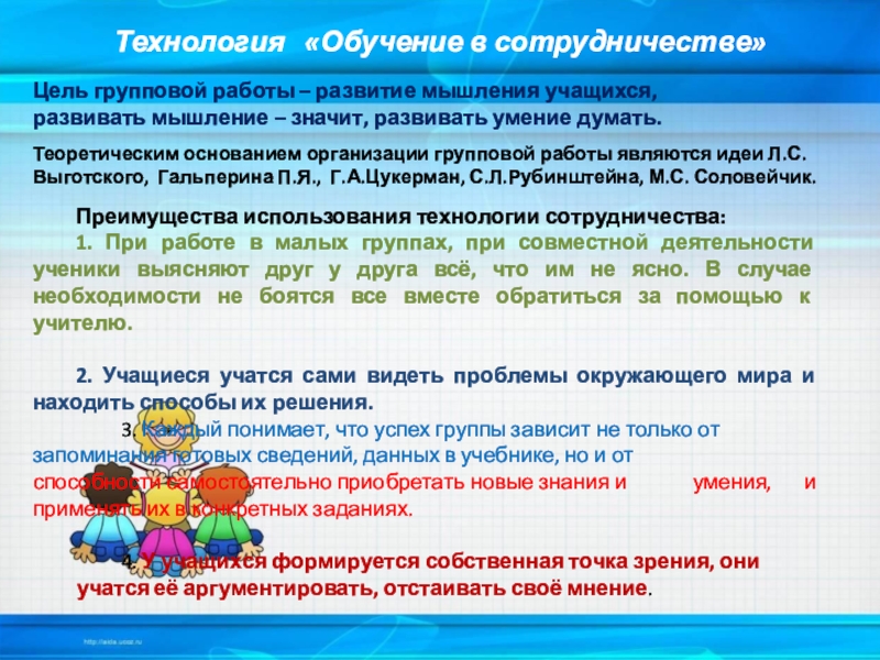 Теоретическим основанием организации групповой работы являются идеи Л.С.Выготского, Гальперина П.Я., Г.А.Цукерман, С.Л.Рубинштейна, М.С. Соловейчик.