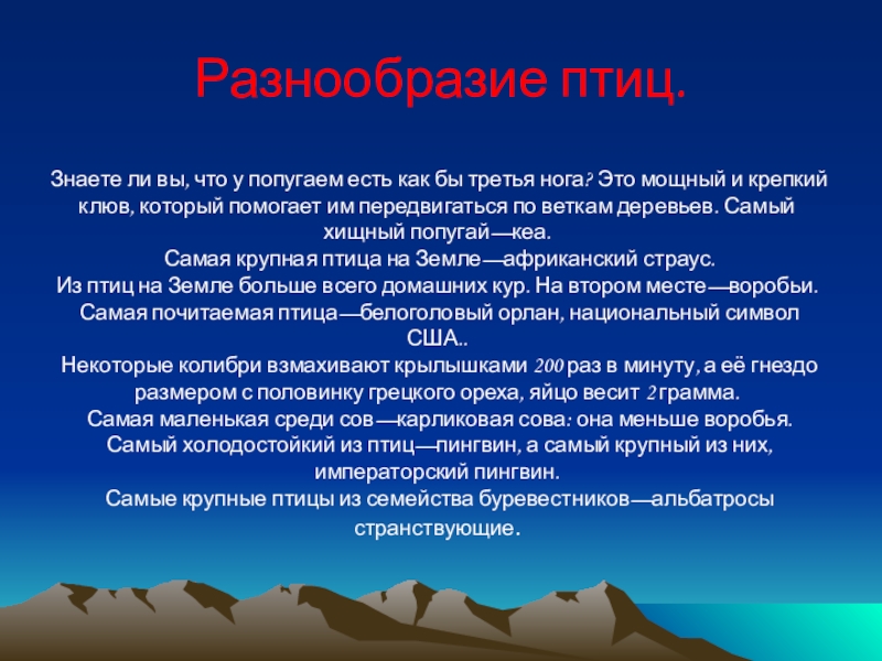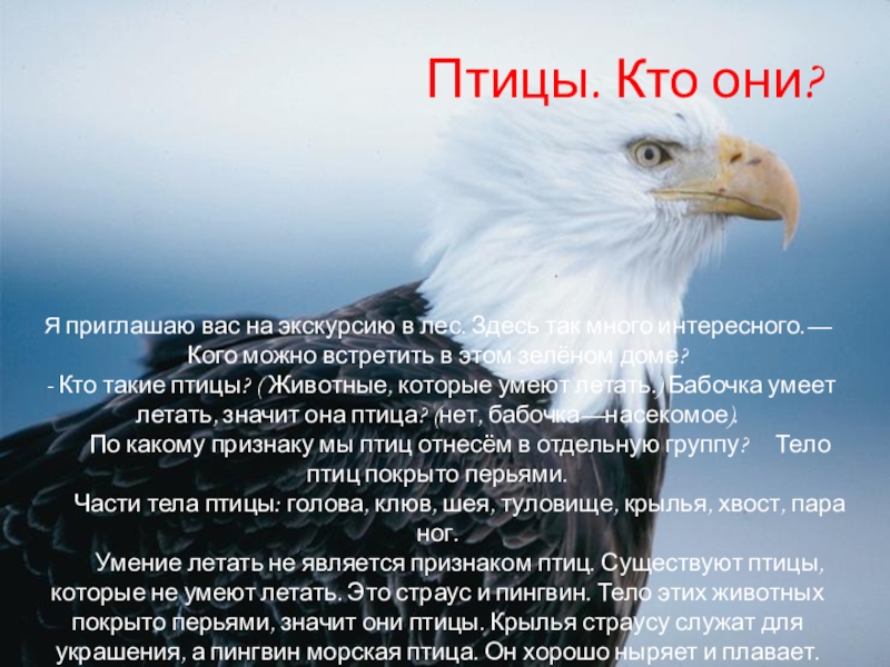 Умение летать не является признаком птиц. Существуют птицы, которые не умеют летать. Это страус и пингвин. Тело этих животных покрыто перьями, значит они птицы. Крылья страусу служат для украшения, а пингвин морская птица. Он хорошо ныряет и плавает.