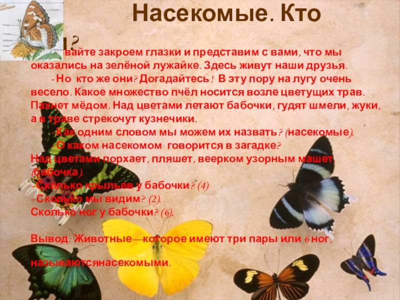- Кто такие птицы? ( Животные, которые умеют летать.) Бабочка умеет летать, значит она птица? (нет, бабочка—насекомое).