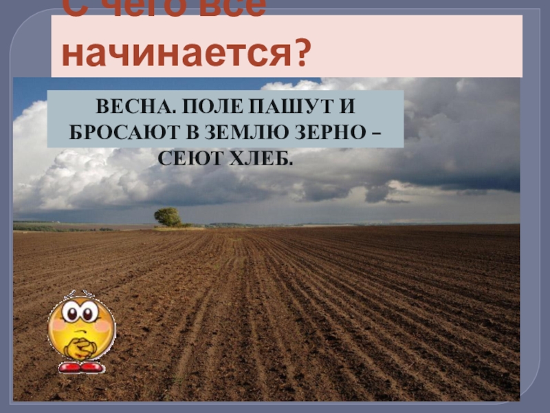 С чего всё начинается? ВЕСНА. ПОЛЕ ПАШУТ И БРОСАЮТ В ЗЕМЛЮ ЗЕРНО – СЕЮТ ХЛЕБ.