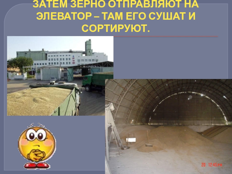Слайд 7ЗАТЕМ ЗЕРНО ОТПРАВЛЯЮТ НА ЭЛЕВАТОР – ТАМ ЕГО СУШАТ И СОРТИРУЮТ.