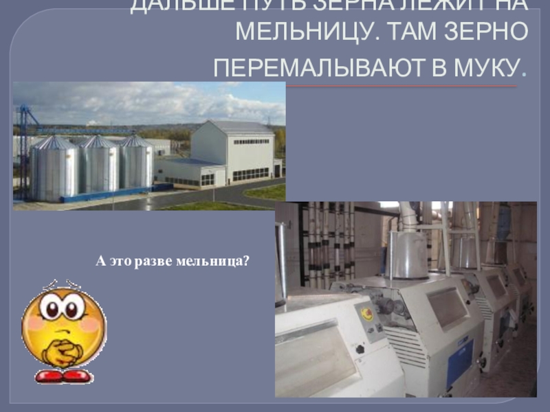 Слайд 9ДАЛЬШЕ ПУТЬ ЗЕРНА ЛЕЖИТ НА МЕЛЬНИЦУ. ТАМ ЗЕРНО ПЕРЕМАЛЫВАЮТ В МУКУ.