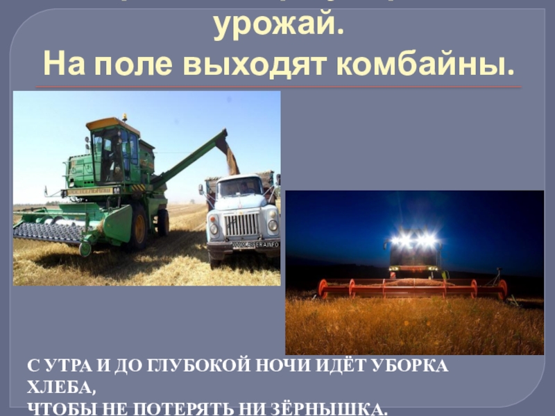 Слайд 5Пришла пора убирать урожай. На поле выходят комбайны.