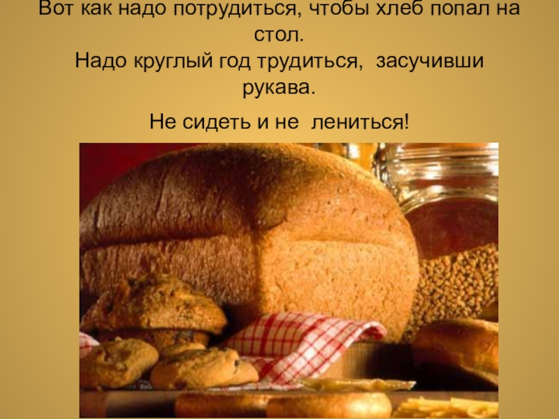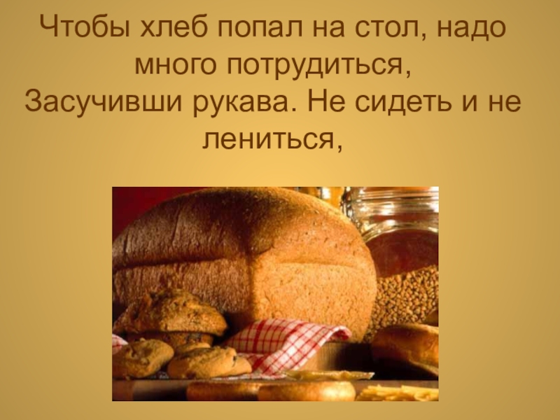 Слайд 3Чтобы хлеб попал на стол, надо много потрудиться, Засучивши рукава. Не сидеть