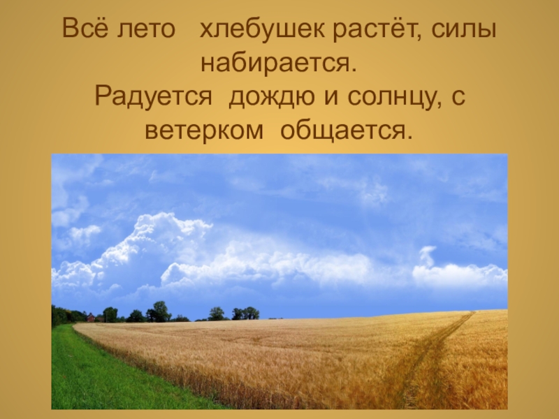 Слайд 14Всё лето хлебушек растёт, силы набирается. Радуется дождю и солнцу, с